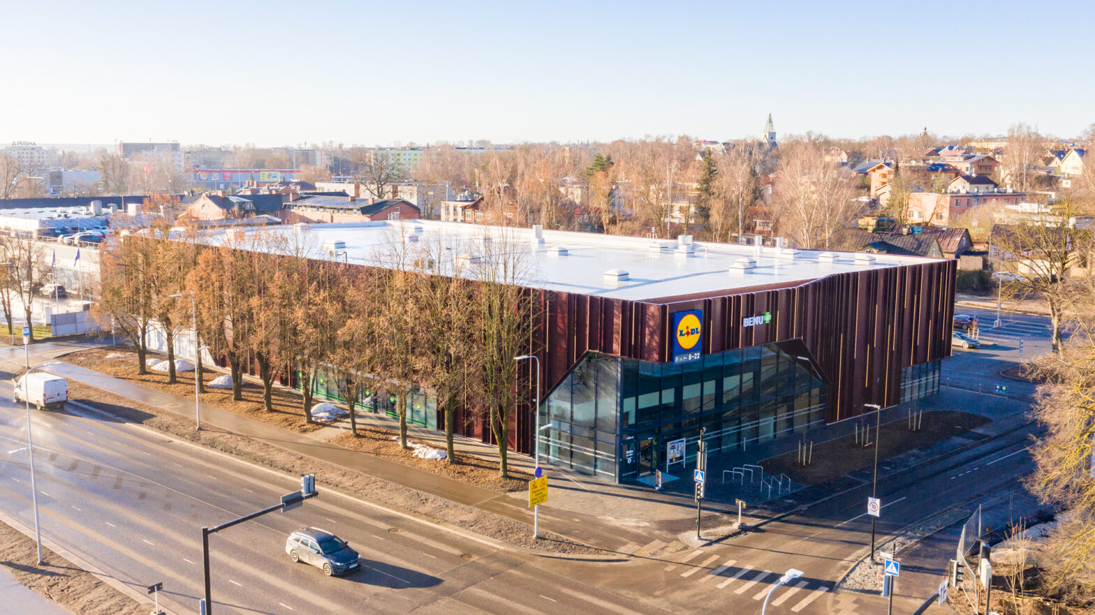 Hoone fassaadi materjalide vormi ja värvide valikul on lähtutud Karlova linnaosale iseloomulikust puitarhitektuurist. Fassaadil kasutatakse ristkülikulisse profiili painutatud komposiitmaterjalist elemente, mis moodustavad puitarhitektuurile omase ribistuse. Lisaks ilmestavad hoonet suured tumehallide raamidega klaasfassaadid, varikatused ja metallrestseinad, mis piiravad hoonealust parkimisala. Hoone üldkontseptsioon põhineb Lidli kaubandushoone tüüplahendustel.