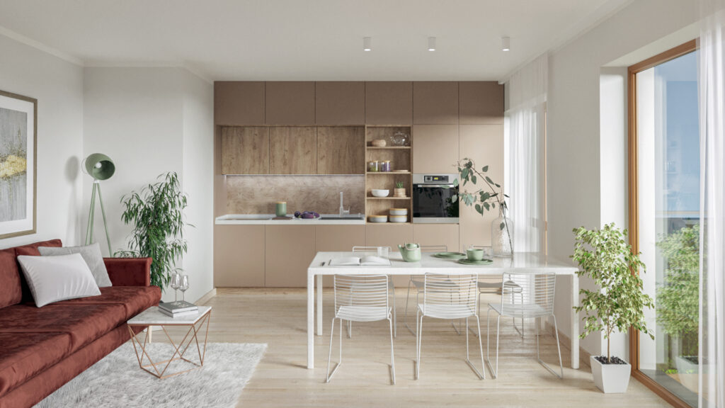 Oskuslikult planeeritud korterid on kompaktse ning läbimõeldud ruumilahendustega. Kõik korterid on varustatud ruumiti reguleeritava põrandaküttega, korteripõhiselt reguleeritava eraldiseisva ventilatsiooniseadmega ja fonopaneelidega. Siseviimistluses kasutakse 3-lipilist tammeparketti, mida on võimalik valida naturaalse ja heleda tooni vahel. Vannitubade seintel kasutakse 30×60 cm keraamilisi plaate, kus põhitooniks on liivakarva plaat ja duši tagusesse seina saab valida halli või musta lahendust. Põrandad tulevad samas toonis duši taguse aktsentseinaga, plaadid on mõõdudega 10×10 cm. Esiku põrandatel kasutatakse sama värvilahendust aktsentseinaga, mis tekitab ühtse terviku.