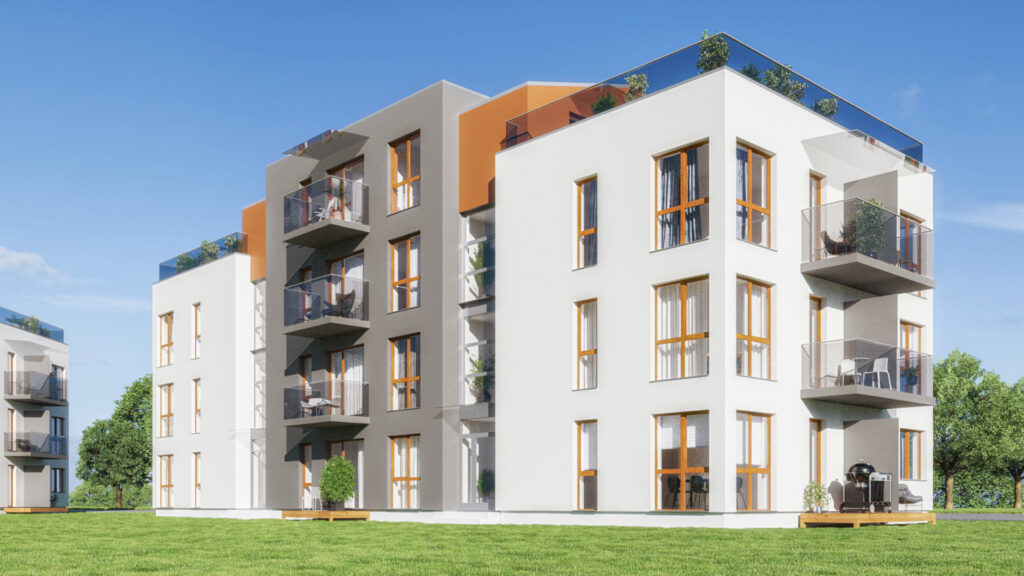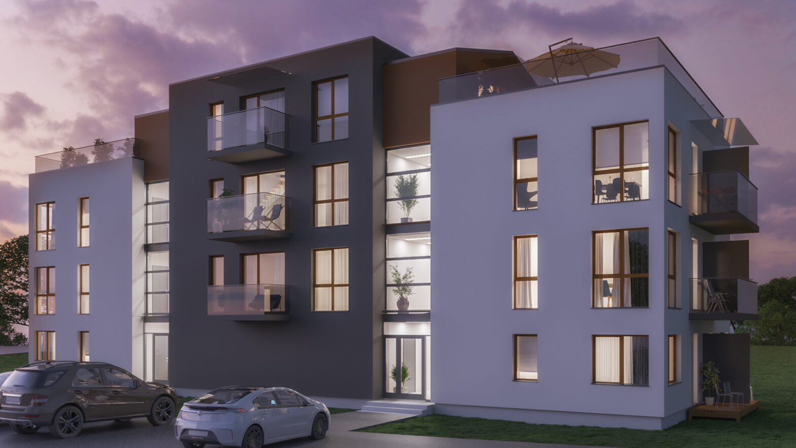 Hoone fassaadil on oskuslikult kombineeritud eri värvi krohvi ja eri värvi aknaraame ning lisaaktsenti annavad klaaspiiretega rõdud ja suured katuseterrassid. Hoone on madal lintvundamendil, betoonist ning täisbetoneeritud väikeplokist kandekarkassiga. Hoonel on esindatud kolme tüüp katus: viilkatus, lamekatus ja pööratud katus. Lamekatuselt ja pööratud katuselt on vihmavesi suunatud ära läbi sisemise äravoolu. Hoone mahus on lahendatud ka soojad ja turvalised panipaigad. Hoonete katustel asuvad päikesepaneelid.