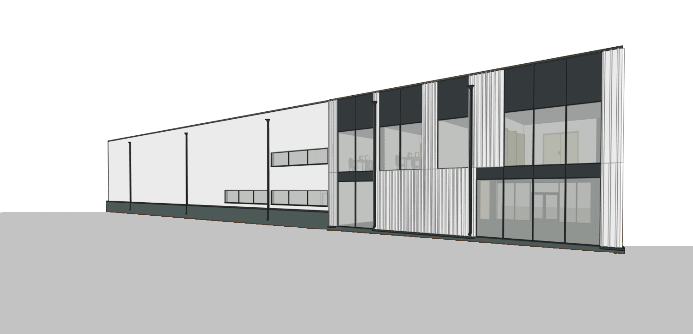 Muidu lihtsat tumehallidest sandwich-paneelidest hoonet katab büroo ja müügisaali osa alumiinium lamellidest fassaad. Laoosa sandwich-paneelid on kaetud kleebistega. Aknaraamide, välisuste ja ka ida poole jäävate tõstuste toon on samuti kõigil läbivalt tumehall. Peasissepääsu kohale on projekteeritud varikatus. Hoone büroo- ja olmeplokile on projekteeritud Tellija logoga valguskastid.